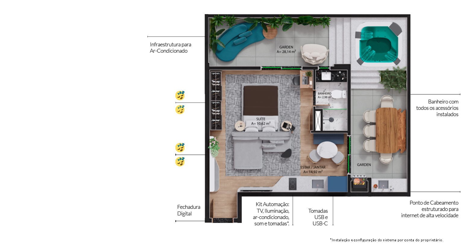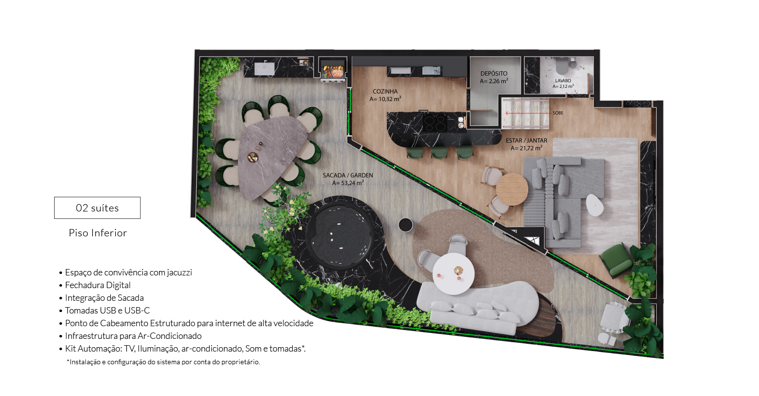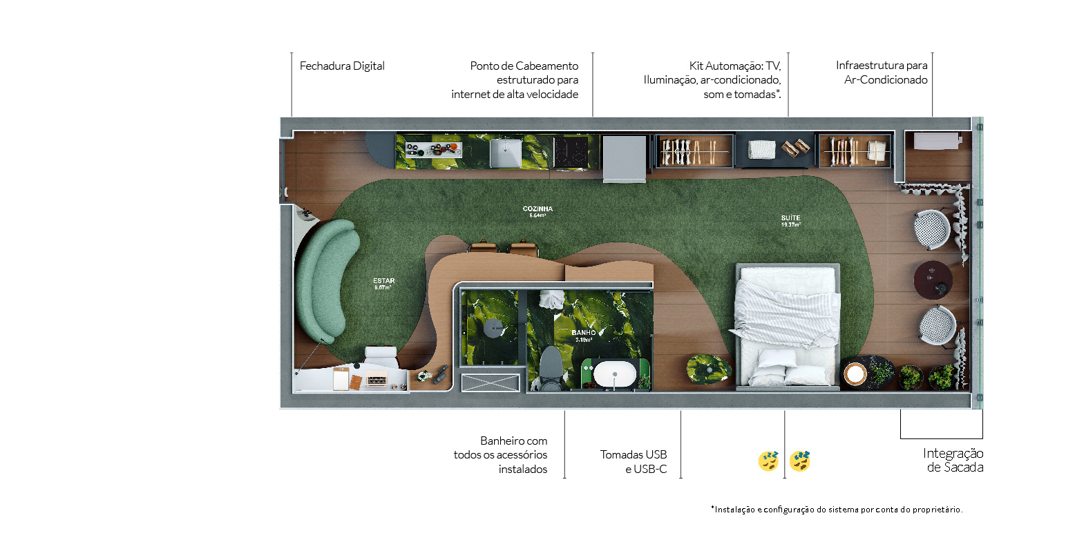 Um projeto inovador com unidades studio, apartamentos e área comum com minimercado, lavanderia e espaço delivery; opções de entretenimento como pub, espaço de jogos, rooftop com piscina, espaços arborizados, pista de corrida e muito mais. Além de tecnologia de sobra para lhe proporcionar máxima segurança e ainda mais comodidades.