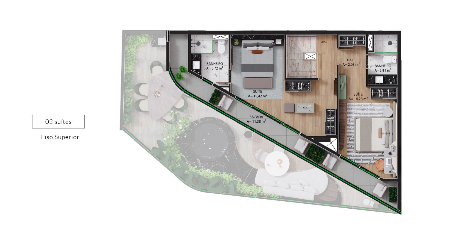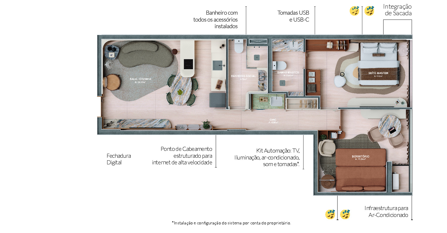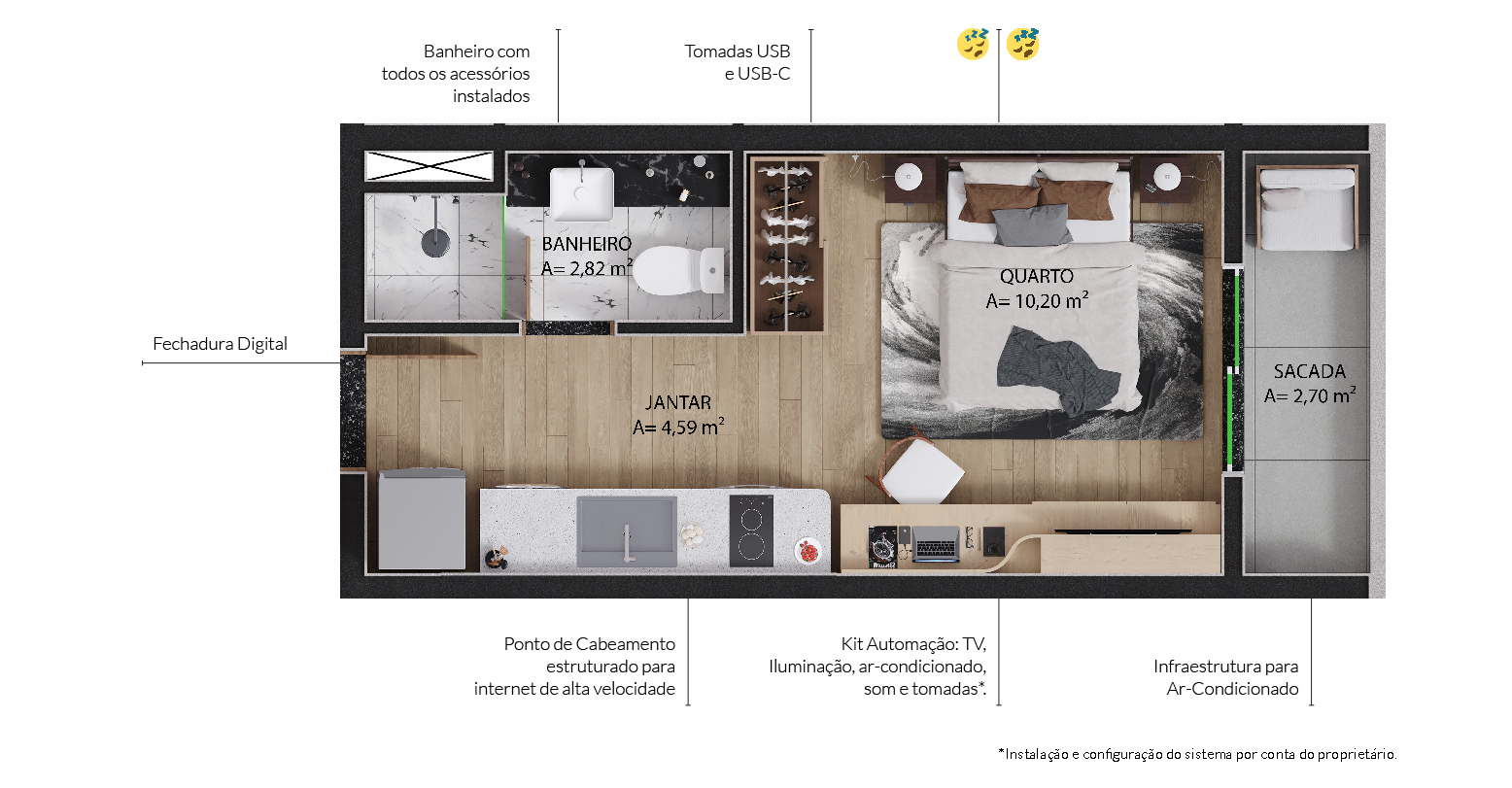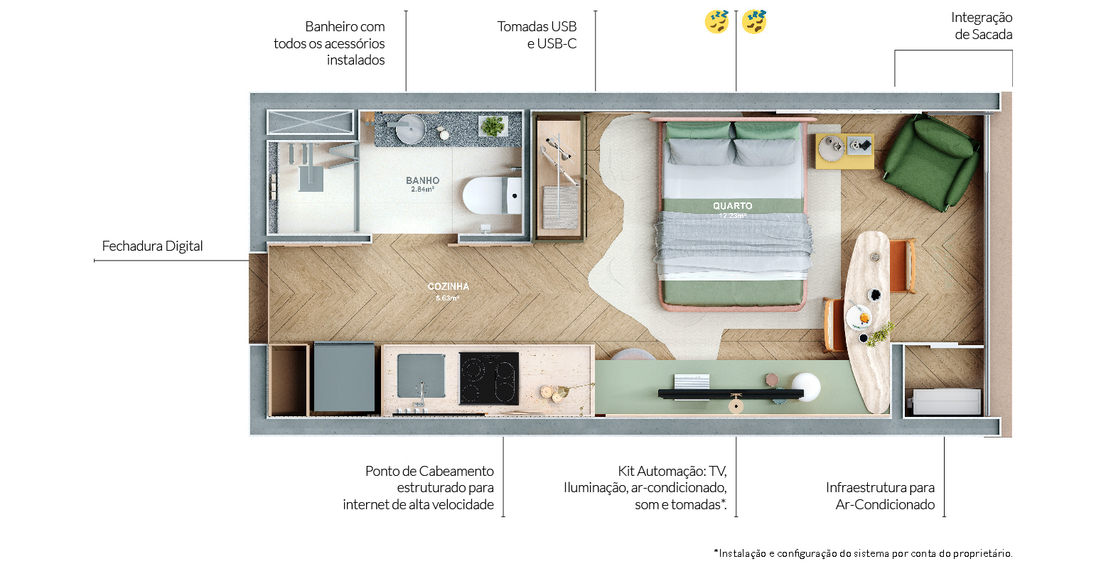 Um projeto inovador com unidades studio, apartamentos e área comum com minimercado, lavanderia e espaço delivery; opções de entretenimento como pub, espaço de jogos, rooftop com piscina, espaços arborizados, pista de corrida e muito mais. Além de tecnologia de sobra para lhe proporcionar máxima segurança e ainda mais comodidades.